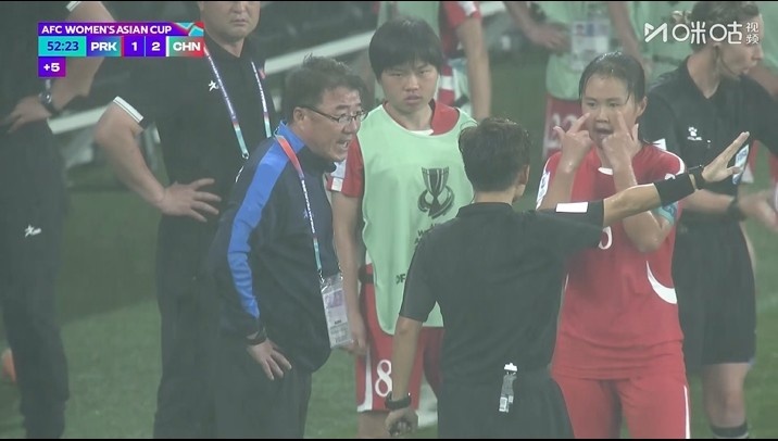 朝鲜女足将帅认为中国女足的中路前插球员(乌日古木拉)参与了进攻,并处在了越位位置,边裁最初似乎也是这么认定的,不过随后的VAR回看推翻了她们的论断。